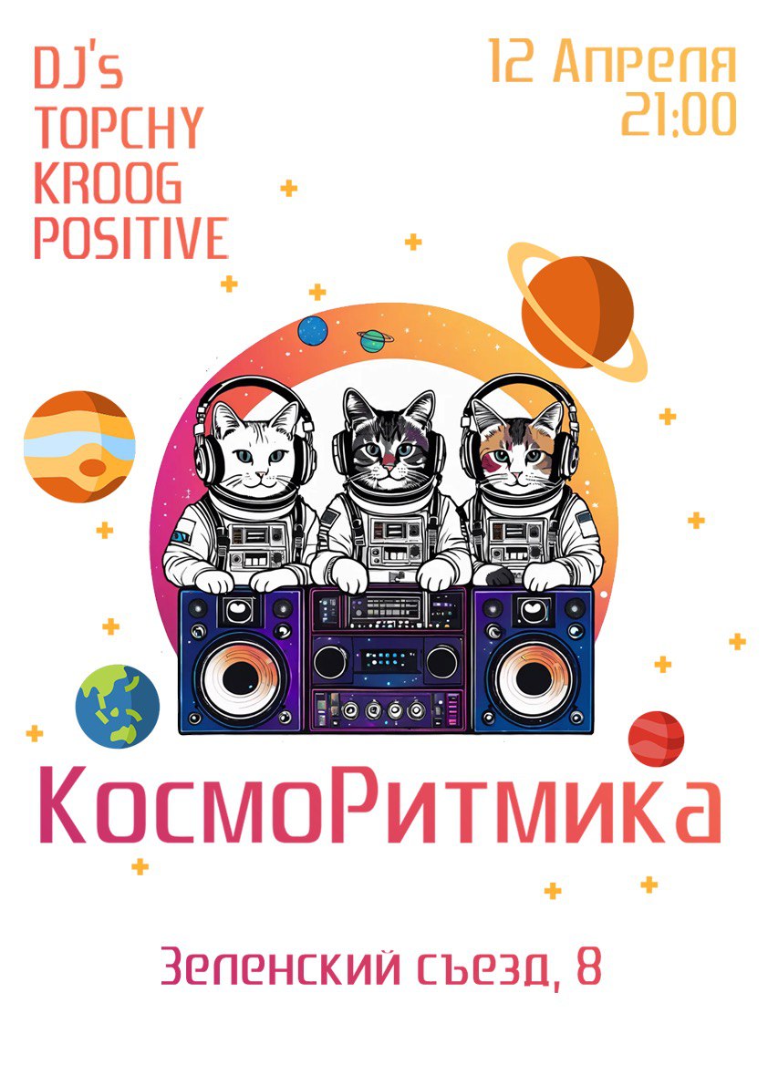 Наш космопорт откроет свои двери 12 апреля в 21:00 по земному времени. Будем рады путешественникам во времени и пространстве, готовым отправиться с нами в музыкальное путешествие. Электронные косморитмы будут звучать всю ночь до возвращения на Землю